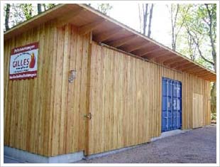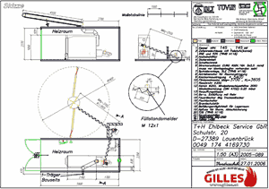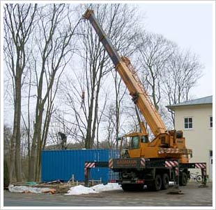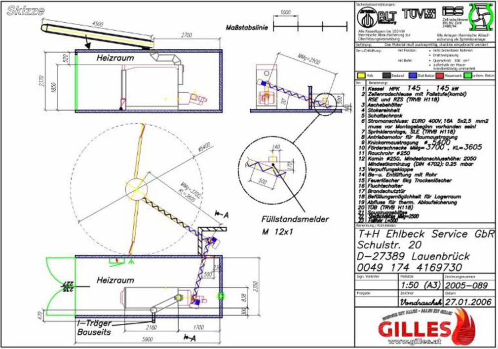Praxisbeispiel - "Haus Wümmetal" in Lauenbrück Seit Mai 2006 betreiben wir eine Gilles-Hackschnitzelheizung im Wärmecontracting (siehe Wärmelieferung) am Alten- & Pflegezentrum "Haus Wümmetal" in Lauenbrück. Der Kessel wurde am Gilles-Firmensitz in Gmunden in einen 20-Fuss-Container installiert und per LKW und Bahn nach Lauenbrück geliefert. Der Hackschnitzelkessel mit 145 kW liefert den kompletten Bedarf für Heizung und Warmwasserbereitung und ersetzt zwei Gasbrenner, die ehemals mit einer installierten Gesamtleistung von 200 kW das Gebäude beheizt haben. Direkt neben dem Container befindet sich das Hackschnitzellager mit ca. 70 m³ Fassungsvermögen. Hier arbeitet eine Knickarmaustragung mit 5,4 m Durchmesser, die das Hackgut an eine 2,2 m lange Steigschnecke übergibt, welche den Höhenunterschied zwischen Austragungsschnecke und Zellenradschleuse ausgleicht.